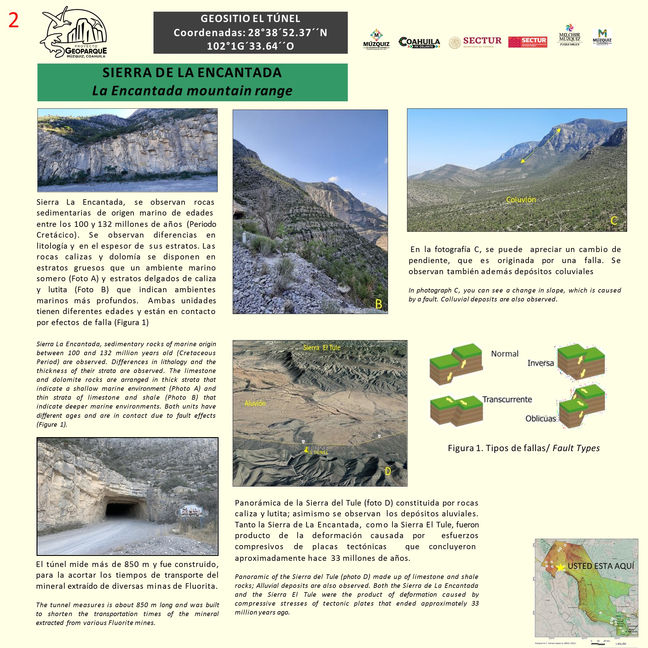 Panoramic of the Sierra del Tule (photo D) made up of limestone and shale rocks; Alluvial deposits are also observed. Both the Sierra de La Encantada and the Sierra El Tule were the product of deformation caused by compressive stresses of tectonic plates that ended approximately 33 million years ago.