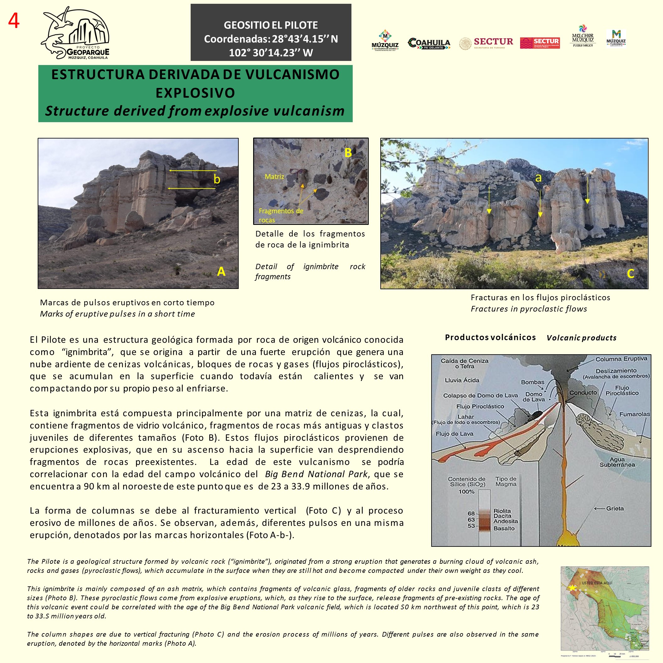 Esta ignimbrita está compuesta principalmente por una matriz de cenizas, la cual, contiene fragmentos de vidrio volcánico, fragmentos de rocas más antiguas y clastos juveniles de diferentes tamaños (Foto B). Estos flujos piroclásticos provienen de erupciones explosivas, que en su ascenso hacia la superficie van desprendiendo fragmentos de rocas preexistentes. La edad de este vulcanismo se podría correlacionar con la edad del campo volcánico del Big Bend National Park, que se encuentra a 90 km al noroeste de este punto que es de 23 a 33.9 millones de años.